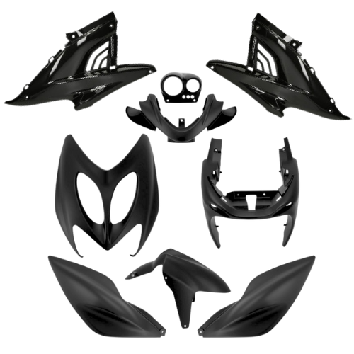 Complete 9-delige kappenset in mat en glanzend zwart voor Yamaha Aerox en MBK Nitro modellen tot 2014. Ideaal voor het vervangen of upgraden van de carrosserie van uw scooter, met een moderne en stijlvolle uitstraling.
