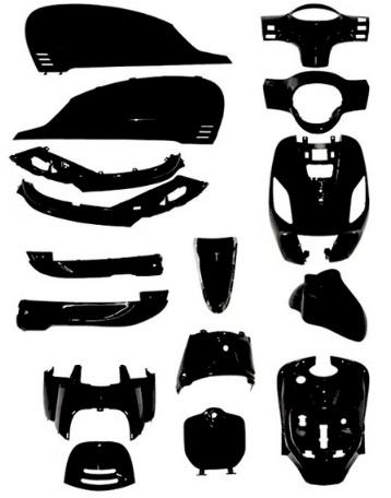 Complete 16-delige kappenset voor Sym Fiddle III scooters, verkrijgbaar in matzwart of glanzend zwart. Perfect voor het vervangen of upgraden van de carrosserie van uw scooter, met een moderne en stijlvolle uitstraling.