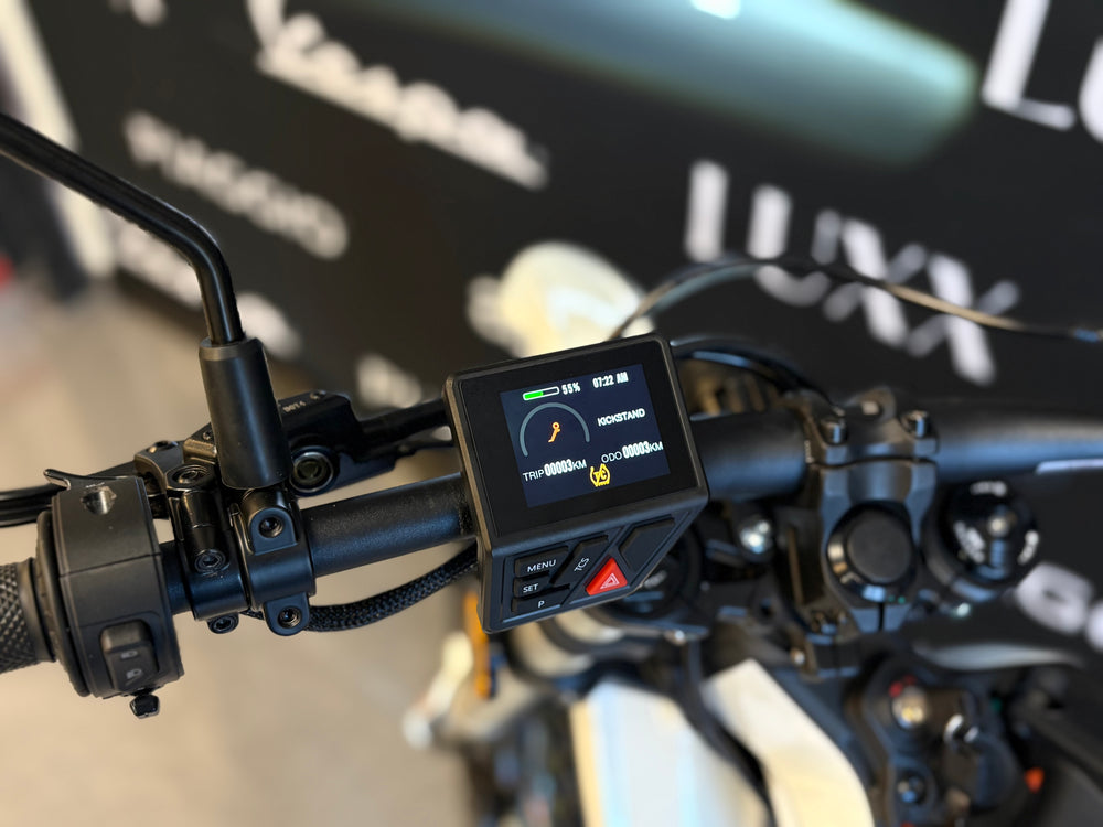 De Zero XB beschikt over een indrukwekkend compact 2,4” (61 mm) volledig kleurenscherm met 3 fabrieksrijmodi (ECO, Standaard en Sport). Maak gebruik van functies zoals Hill Hold, aanpasbare regeneratiesnelheid, een kantelsensor die het gas afsluit bij een val, tractiecontrole, cruisecontrol en zelfs achteruit – alles te selecteren via de intuïtieve interface van het dashboardmenu.